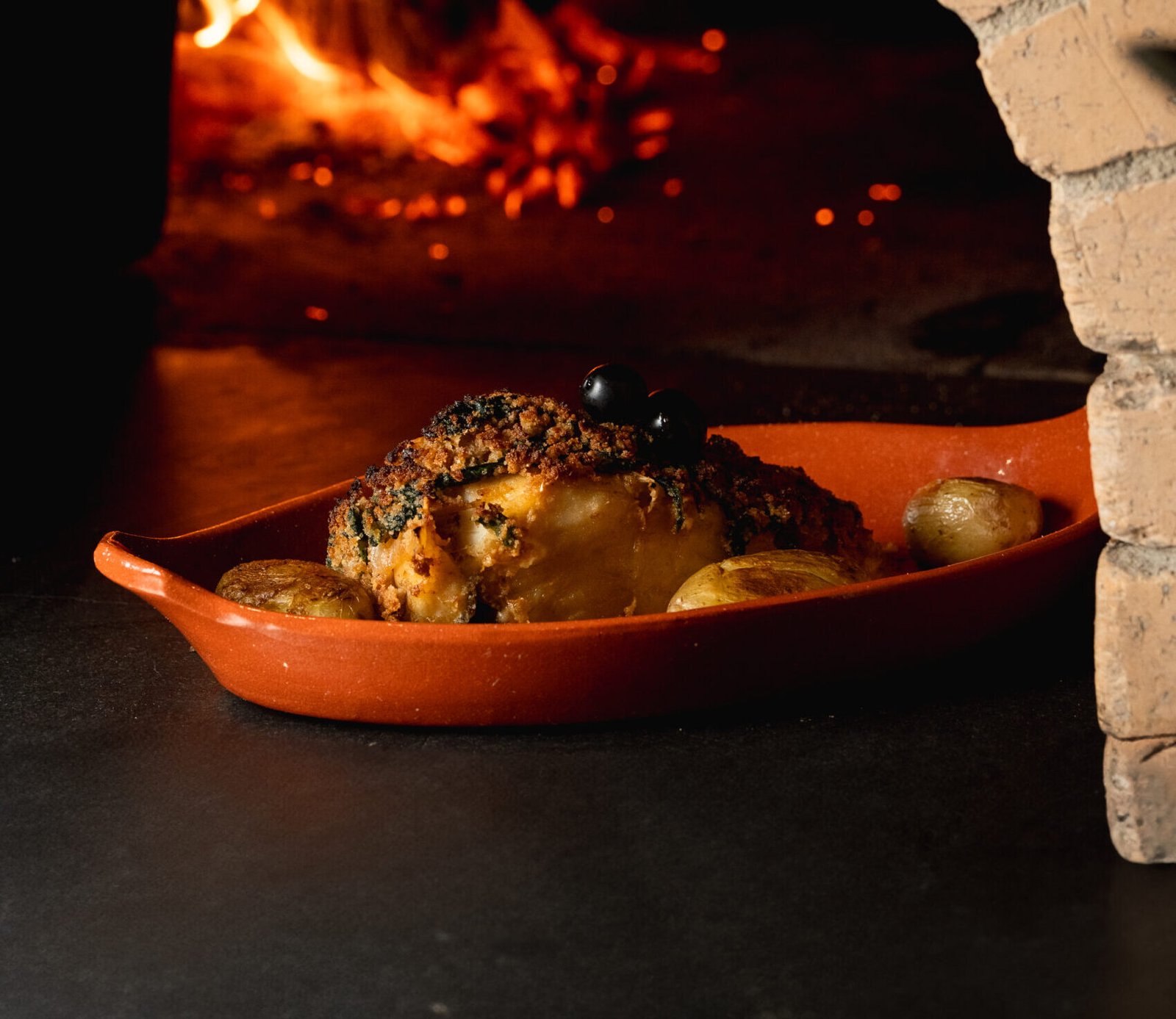 Peixe gratinado em forno a lenha.