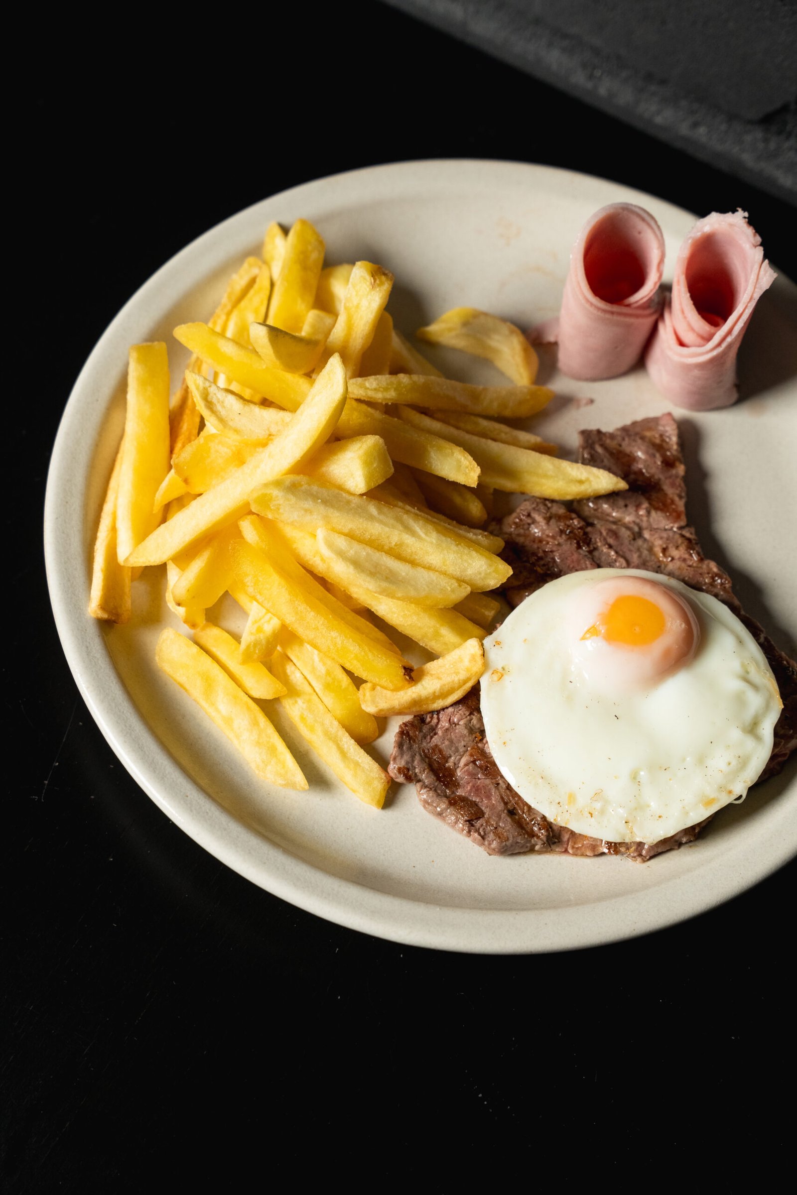Bife novilho, ovo, queijo, fiambre e batata frita.