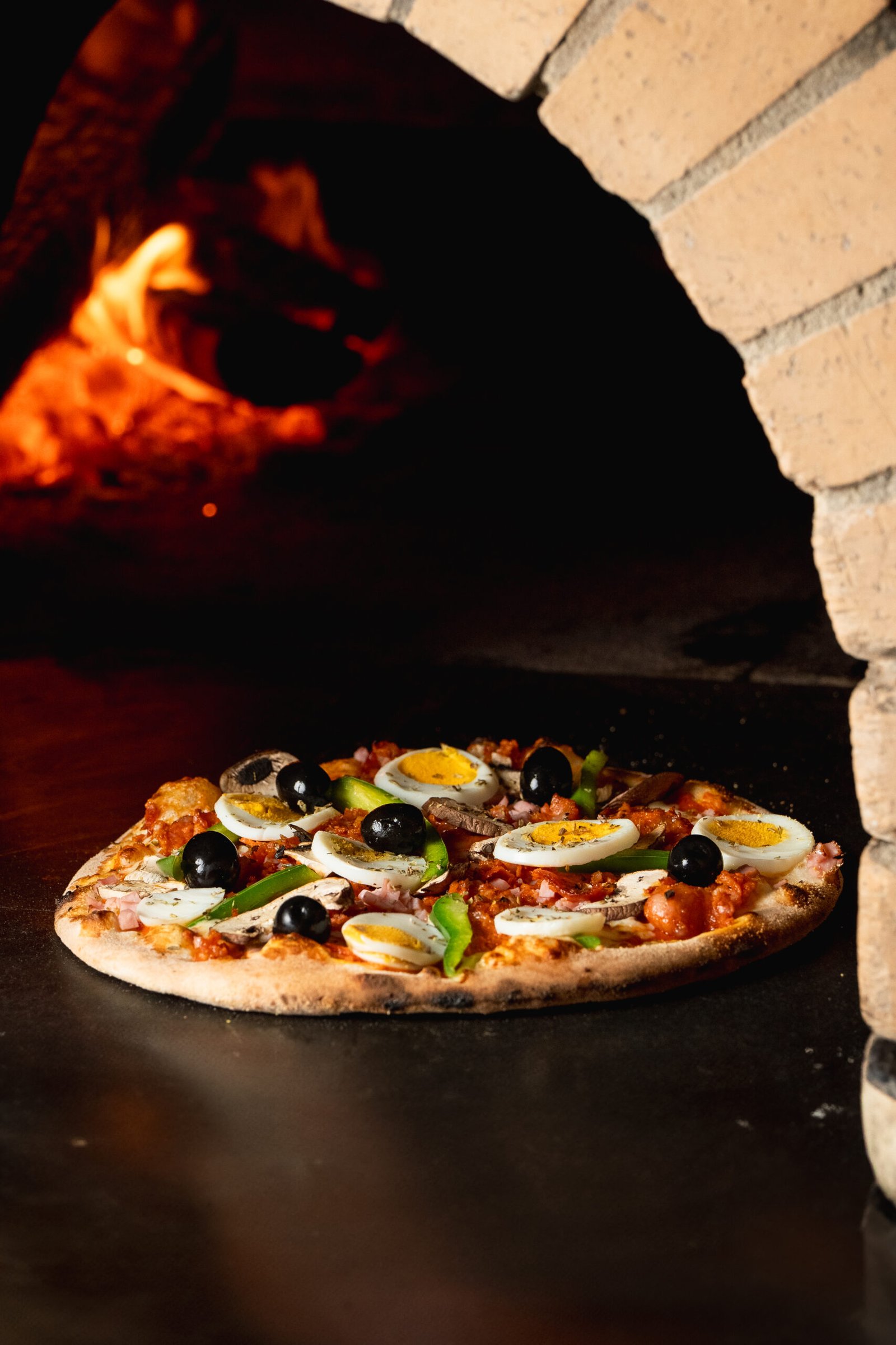 Tomate, mozzarella, pimento, cogumelos, fiambre, chouriço, ovo, azeitona e orégão.