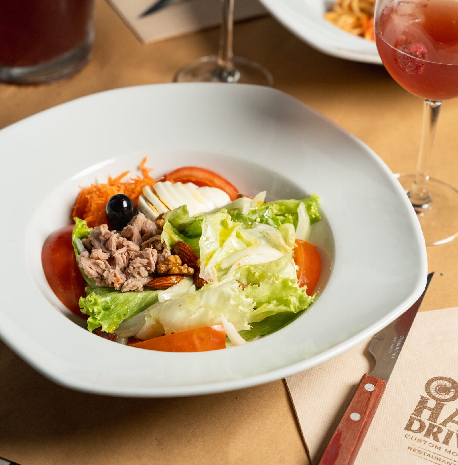 Alface, tomate, cebola, ovo cozido, cenoura, atum, azeitonas e frutos secos.